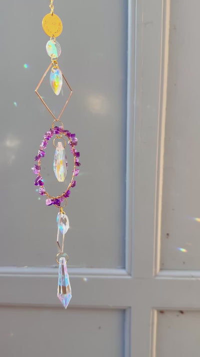 Orné de cristaux facettés et de pierres naturelles d’améthyste soigneusement choisies, il agit comme un capteur d’énergie et de lumière :