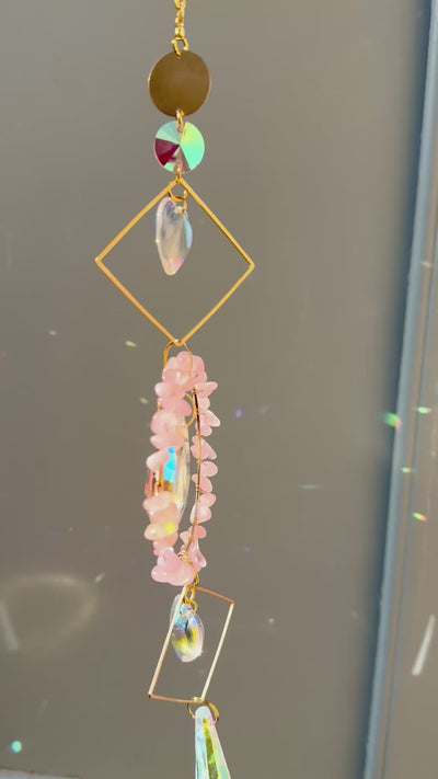 Orné de cristaux facettés et de pierres naturelles de quartz rose soigneusement choisies, il agit comme un capteur d’énergie et de lumière :